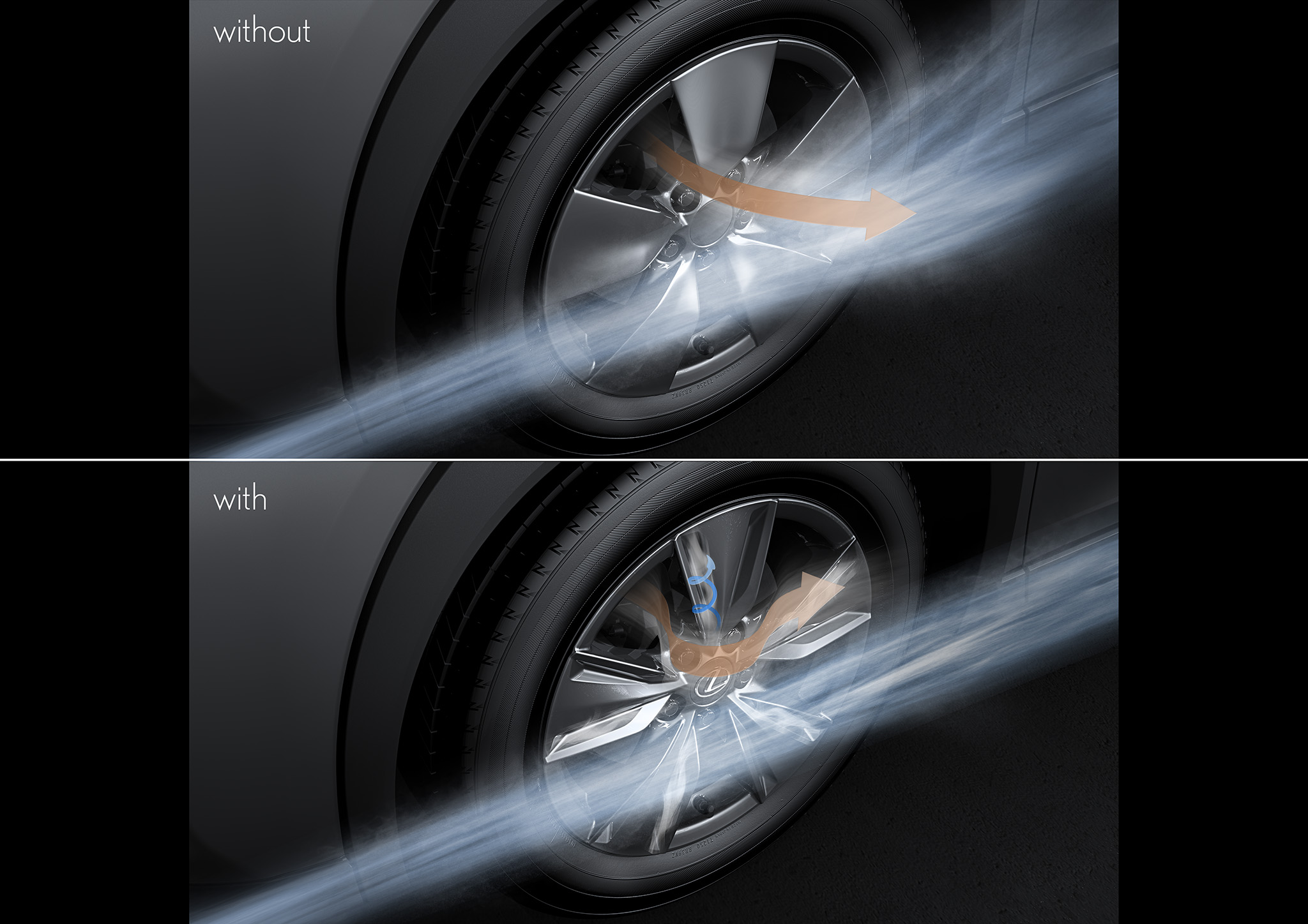 Con un acabado en plata metalizada, las llantas aeroventiladas de 17 pulgadas incorporan unas pestañas a ambos lados de los radios, y no tiene precedentes en Lexus. La forma de las pestañas se basa en la “pestañas Gurney” empleadas en el alerón trasero de los bólidos de Fórmula 1 para regular el caudal de aire e incrementar la carga aerodinámica. Este innovador diseño de las llantas permite una conducción más segura, con un frenado más estable, una refrigeración más eficiente y unas menores turbulencias por los laterales del vehículo.