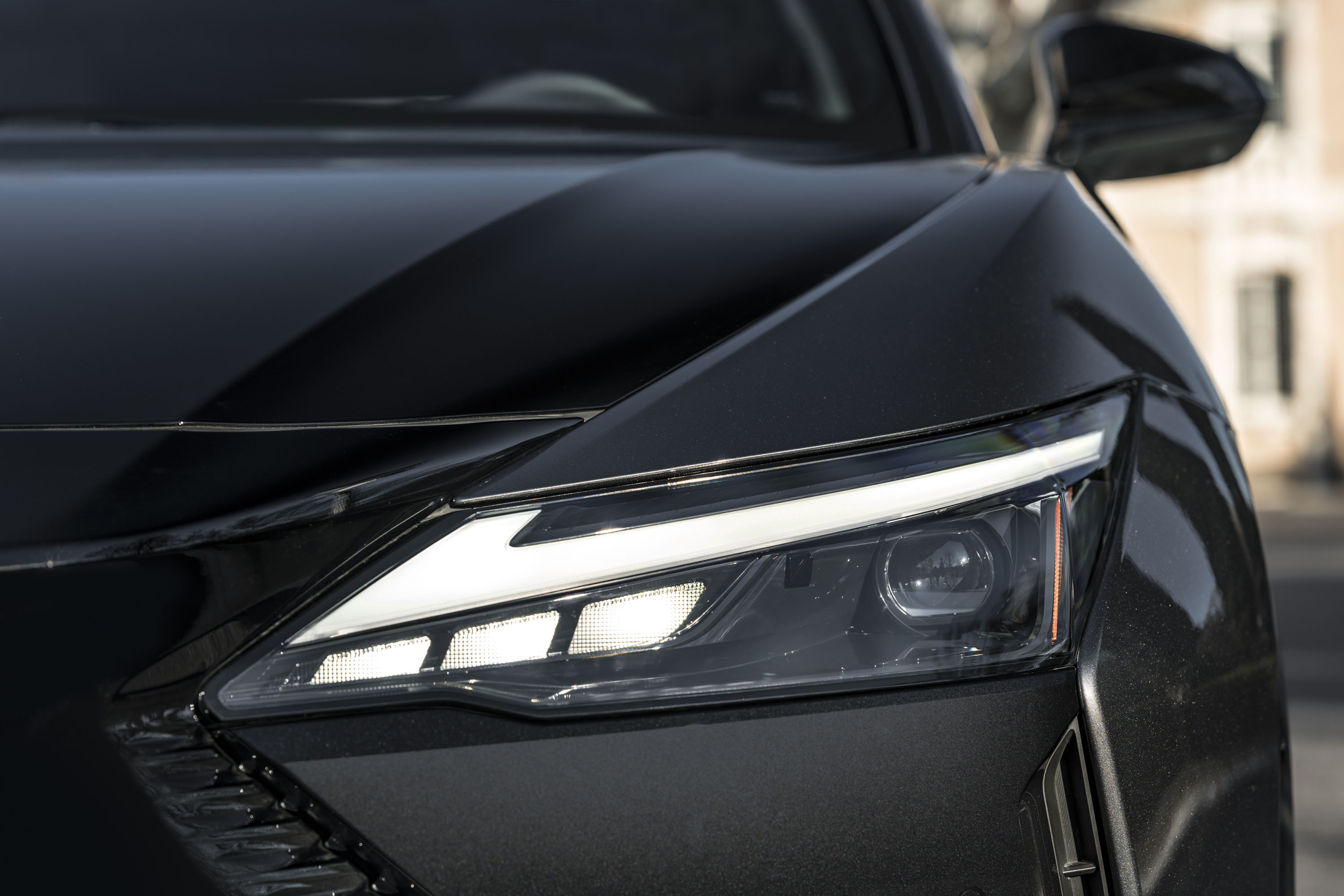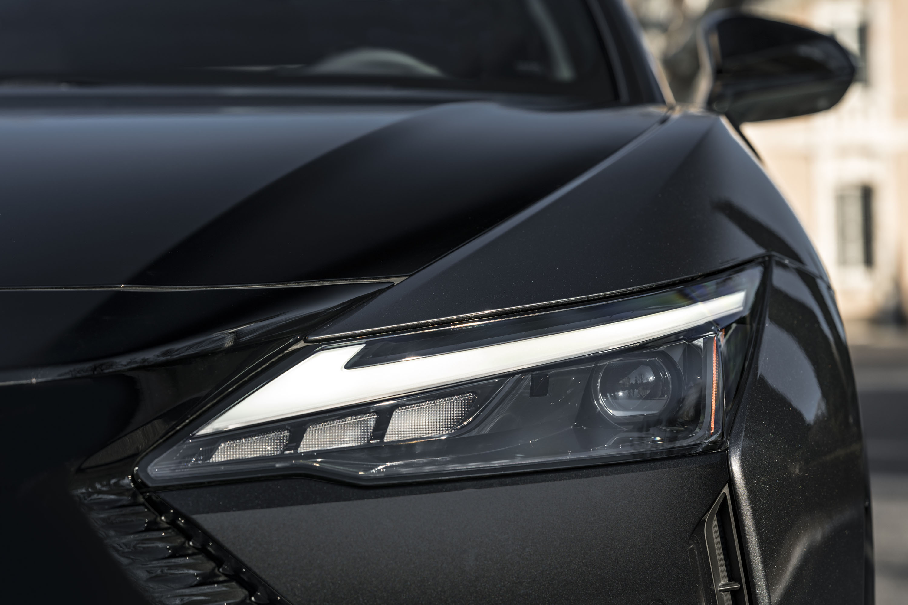 Los grupos ópticos de nuevo diseño forman una unidad con la carrocería de doble punta de flecha. Estos faros ultrafinos acentúan el motivo en L de Lexus de las luces de circulación diurna, mientras que los faros frontales propiamente dichos y los intermitentes sobresalen menos.