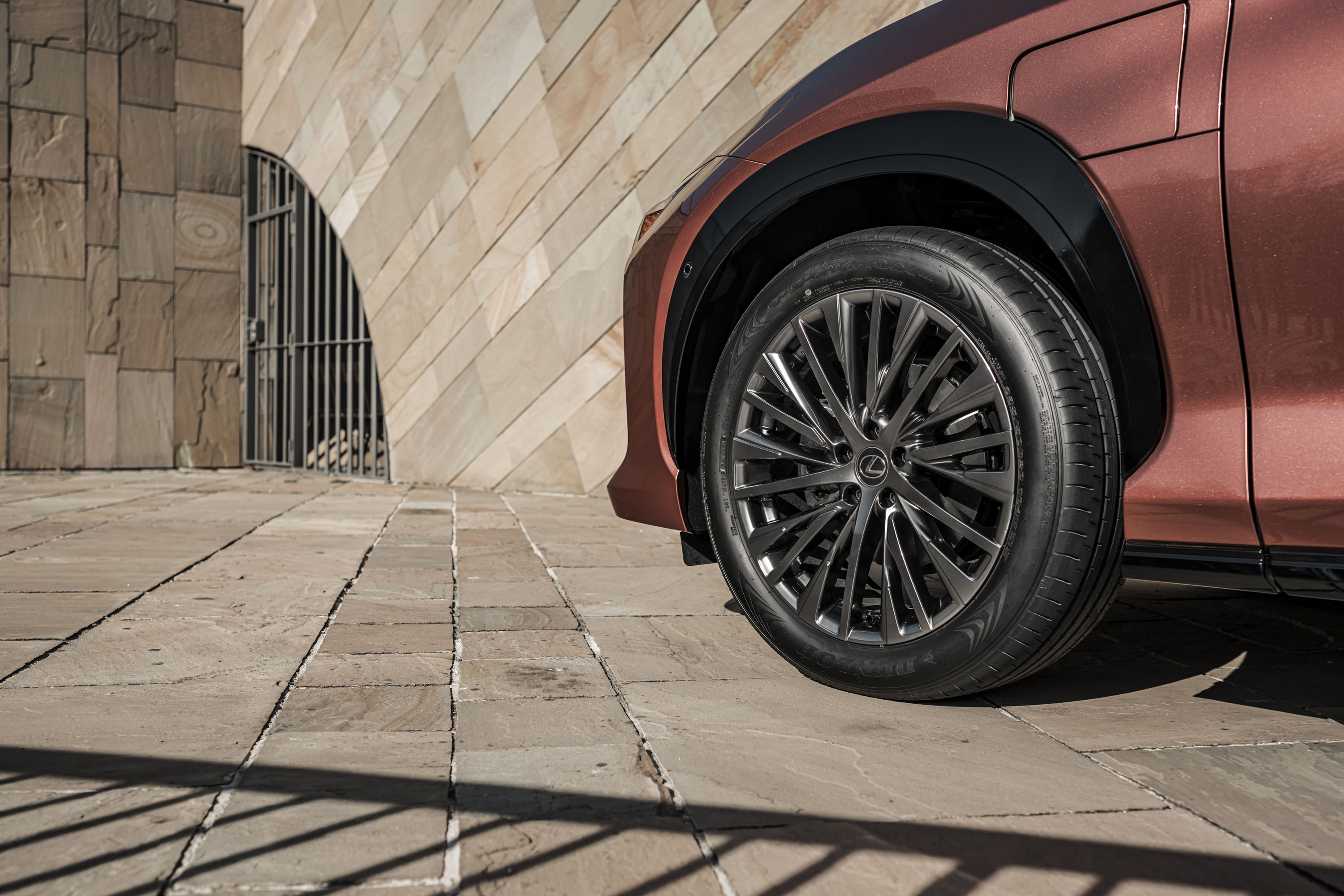 La barra de luces LED alargada que atraviesa el vehículo se ha convertido en un rasgo distintivo de diseño de Lexus. En este caso, se envuelve en torno a la potente parte posterior con un patrón geométrico, y comprende una sección central excepcionalmente fina que resalta intensamente el nuevo emblema de LEXUS en el portón trasero. El ancho de vía trasero se ha ampliado hasta los 1627 mm (15 mm más que el delantero), lo que enfatiza aún más el aplomo del vehículo y su imagen robusta.